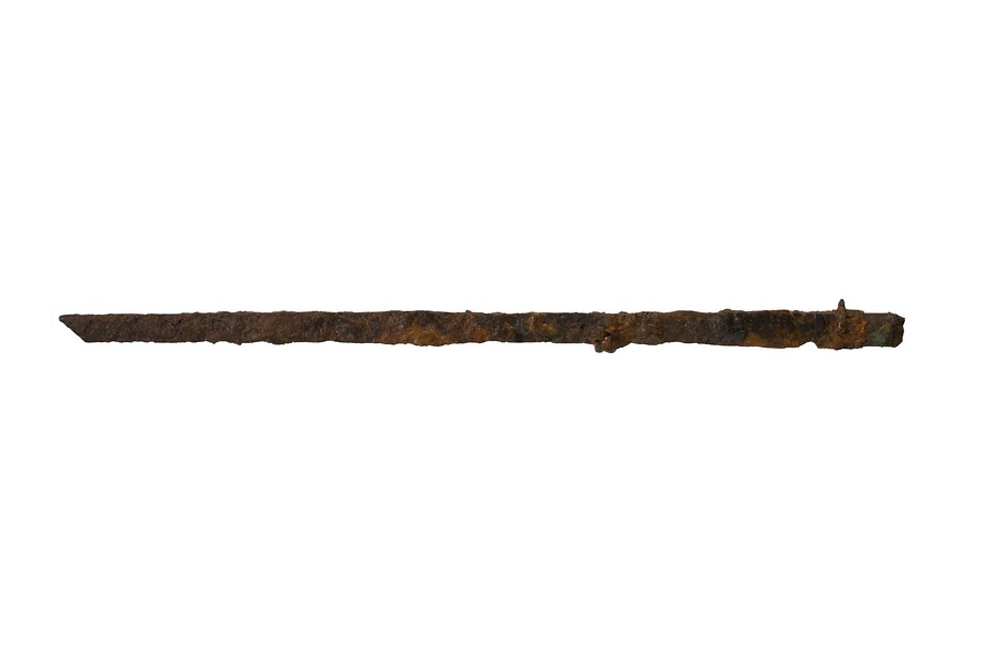 横穴式石室から、武器類、馬具類、金銅耳環、土師器、須恵器等、多くの副葬品が出土した。このなかで特記される出土品として、刀身基部付近に「戊辰年五月□(中力)」の銅象嵌銘をもつ鉄刀一口がある。