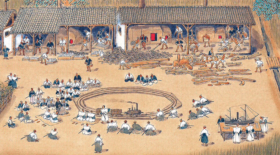 長崎警備増強のため蒸気軍艦を主力とする洋式海軍の創設を企図した佐賀藩は、嘉永5年(1852)に理化学研究所である精煉方を発足させた。佐野常民を主任として石黒寛次・中村奇輔・田中久重ら藩外の優秀な学者や技術者が招かれた。彼らは洋書を翻訳して化学実験や機械の試作を行うとともに、長崎での海軍伝習にも参加してオランダ人教官から直接造船法や蒸気船の内部構造について教えを受けた。画面中央には安政2年(1855)に行われた蒸気機関車の雛形の試運転の様子、右下には蒸気船の雛形が描かれている。