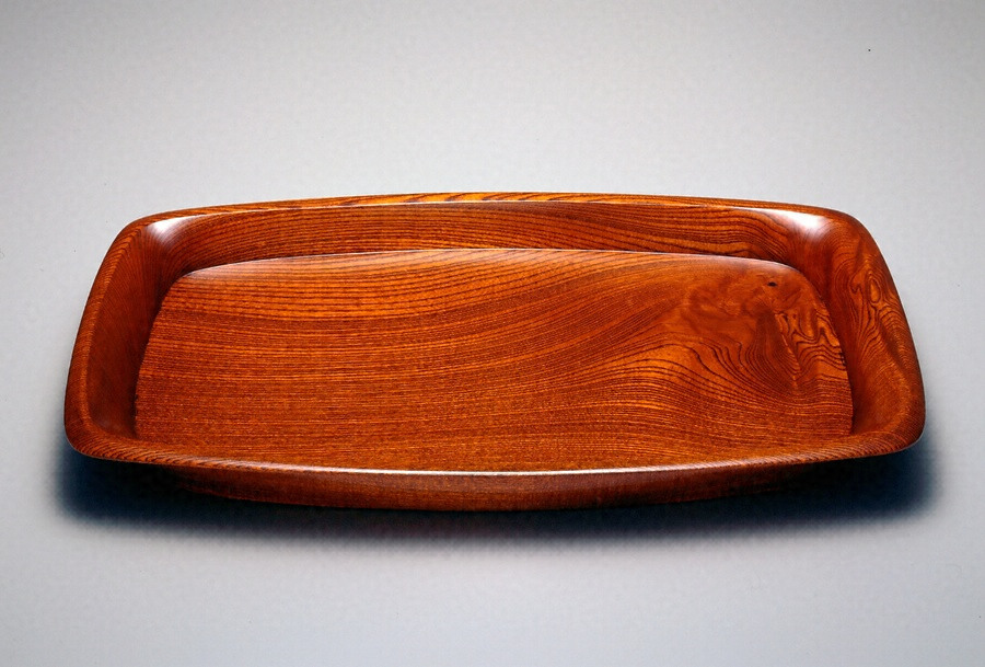 本作品は、素直な木目を主としながら部分的に変化のある木目の欅を用い、刳物の技法で一枚板から刳り出したもので、柔らかく張りのある曲線・曲面で構成される。荒刳りした後、数種類の鑿と鉋を用いて器形を削り出し、拭漆と水研ぎを繰り返して細部の形状を整えながら表面を滑らかにし、さらに拭漆を十数回繰り返して仕上げている。