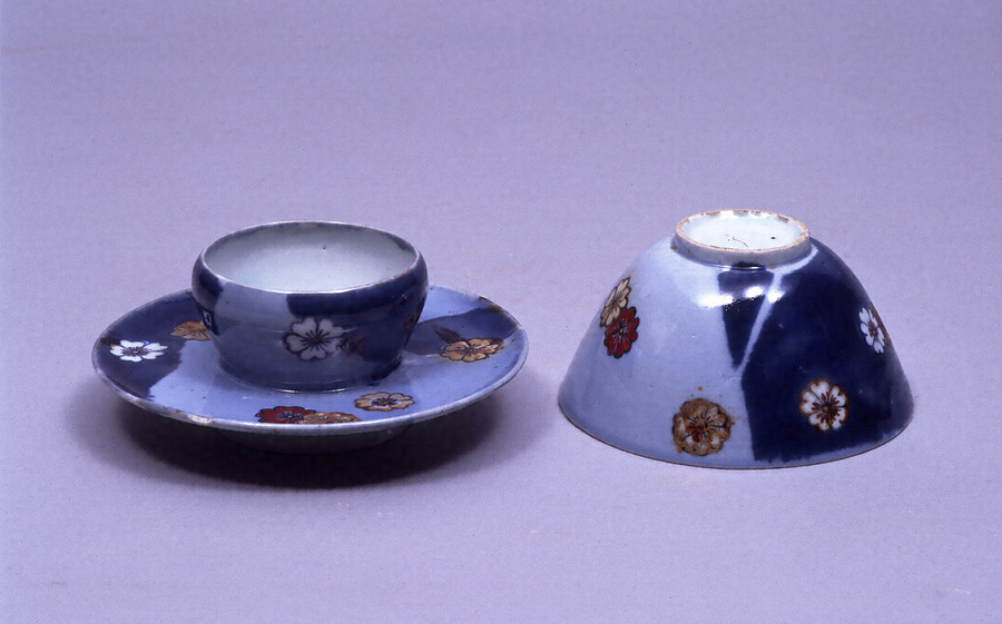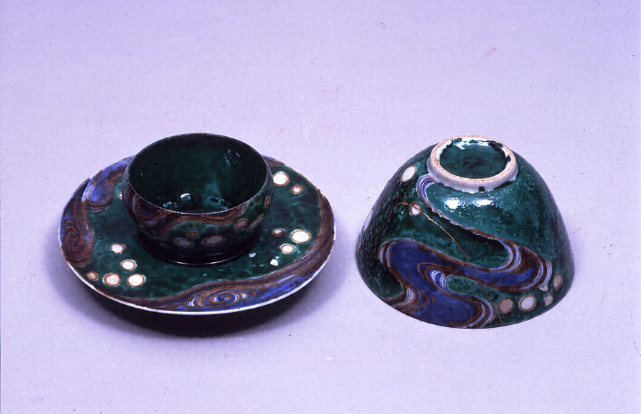 瑠璃釉桜花散文と流水文の碗。器形、成形の特徴から、両者は同一陶工の手になる。桜花散文は濃淡瑠璃釉を掛け分け、桜花に赤、金を使用。流水文は染付で流水をあらわした素地に金彩で流水と水玉をあらわし、地を緑絵具で濃く塗り埋める。ともに金彩の使用開始年代が遡る例として貴重な資料。同文様の台を伴った図柄や器形なども珍しく、焼成技法や色絵手法、釉薬の用い方に見られる特徴からは、大川内山に鍋島藩窯が築かれる以前の有田岩谷川内の御道具山を推測することができ、また色絵に金彩を使用する開発期の貴重な作例といえる。初代鍋島勝茂から菩提寺である高伝寺に寄附され、大正14年に鍋島家に返納された。