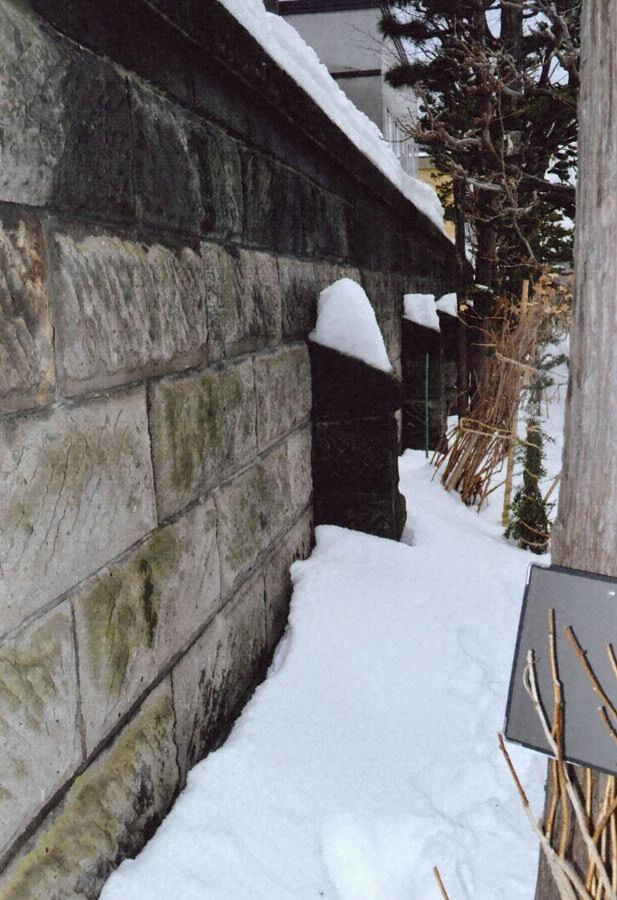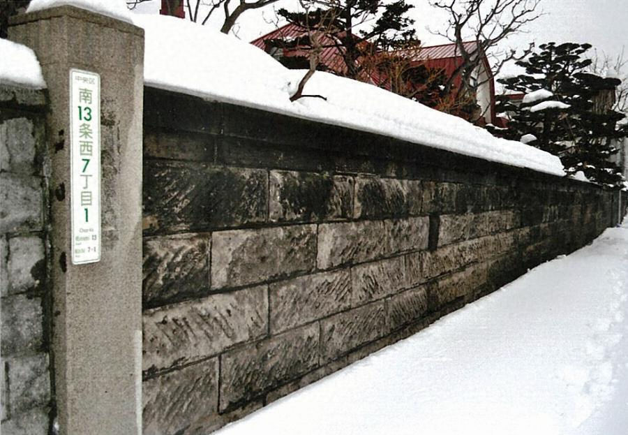 南北の敷地境界に建ち、総延長77mを測る。江戸切仕上げの石塀で、敷地側には4m毎に控柱を付す。北塀は六段積で高さ2.1m、南塀は八段積で高さ2.7m。ともに上部に薄いブロック石と笠石が載る。軟石の風合いが敷地景観に落ち着きを与える。