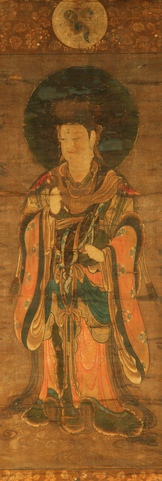 十二天は、もとインド古代神などが仏教にとり入れられて護法神となったもの。帝釈天(東)、火天(東南)、焔摩天(南)、羅刹天(西南)、水天(西)、風天(西北)、毘沙門天(北)、伊舎那天(東北)までの天が各方位にあてられてはじめ八方天として成立した。これに梵天(天)、地天(地)、日天(日)、月天(月)が加わって十二天となる。わが国の十二天像の作例は奈良・西大寺本がもっとも早く、ついで大治2年(1127)に、五大尊像と同時に描かれた京都・東寺本がある。これらは後七日御修法(ごしちにちみしほ)などの密教の大法に用いられた。本図のように荷葉座や毛氈座、涌雲上に立ち上部に種子(しゅじ)を表すものは、灌頂(かんじょう)の儀式に用いられた十二天屏風の形式であり、平安後期から十二天行道に代わって懸用されたものとみられ、先行する作品には建久2年(1191)制作の東寺蔵詫磨勝賀筆本、京都・神護寺、滋賀・聖衆来迎寺本などがある。本図ももとは屏風仕立てであっただろう。