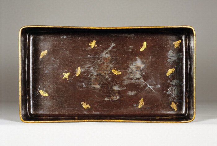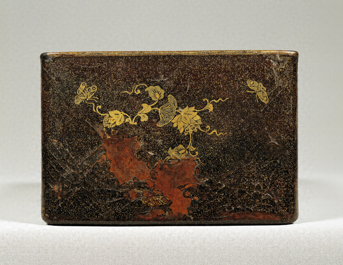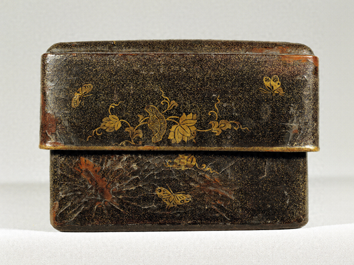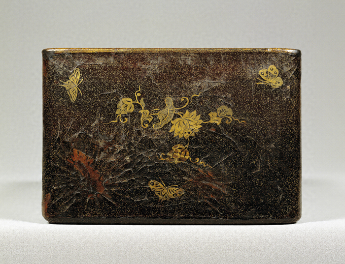 型で成形した獣皮に漆を塗りかためた漆皮(しっぴ)製の経箱。長方形、被蓋造(かぶせぶたづく)りで、蓋甲に漆皮箱としては珍しく塵居(ちりい)(甲面と側面の接点にあるわずかな平坦部)を作る。蓋・身とも外面はまばらに金粉を蒔いたのち(平塵地(へいじんじ)という)、大小二種の金粉と銀を多く含む青金粉を蒔き分け蓮唐草を花枝風に表し、間地に蝶を遊飛させている。文様の配置は、蓋甲では中央と四隅、蓋の各側面の中央に蓮唐草文を置くように規則性があり、対称的に整理された文様構成が好まれた奈良時代から平安前期にかけての工芸品の伝統を受けついでいる。それに対し、蓋裏は淡い平塵地に蝶を不規則に散らしており、散らし文が好まれた平安後期の工芸品らしさを見ることができる。身の長側面には精緻な金工技法による金銅製蓮華様の対葉花文をかたどった透彫りの紐金具をつけている。平安時代、貴族たちによって平家納経に代表される豪華で優美な荘厳を具えた経典が写されたが、本品はこのような装飾経を納める経箱として制作されたものであろう。