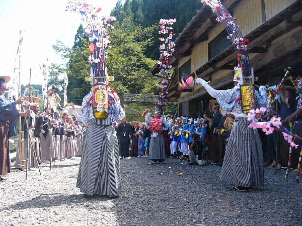 太鼓踊の一種で、拍子方と呼ばれる四人の青年が背にシナイという大きな花(全長三m、重さ五キロ)を背に負い、胸につけた太鼓(一人は鉦)を打ちながら輪の中で激しく踊り回る。その他出花持ち、鬼面の悪魔払いや薙刀振り、ささら摺り、田打ち、大黒舞、奴、花笠、おかめ踊、それに笛、地歌方、幟持ち、台傘持ちなど総勢一三〇余人による華やかな踊である。