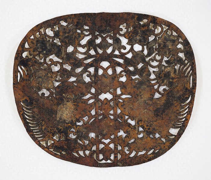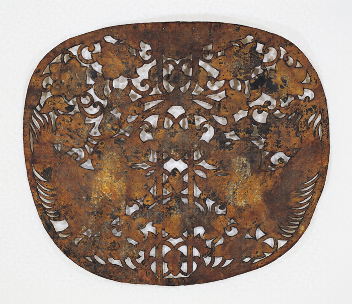 革製 牛皮材 彩色 金泥 截金 透彫 迦陵頻伽文