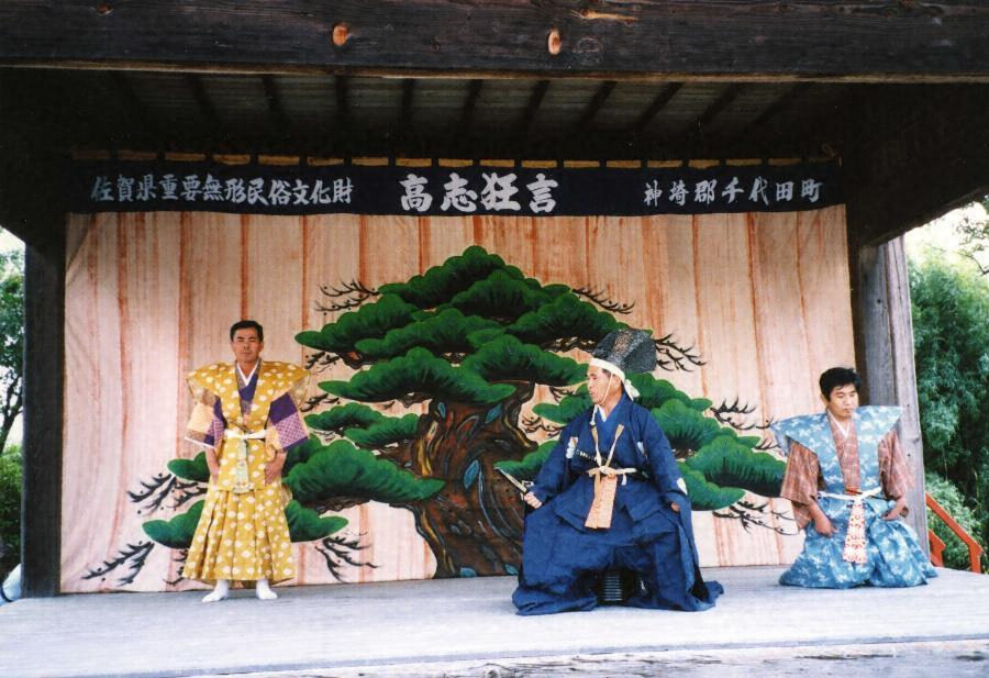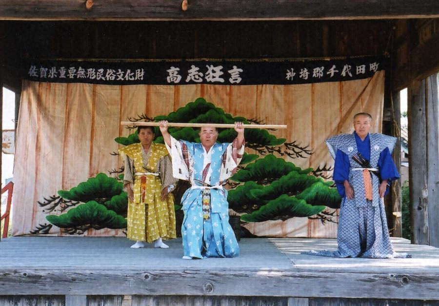 この芸能は、佐賀県神崎郡千代田町高志【たかし】に伝承される狂言で、高志神社の春秋の祭のおり(十月十三日)に上演奉納される。