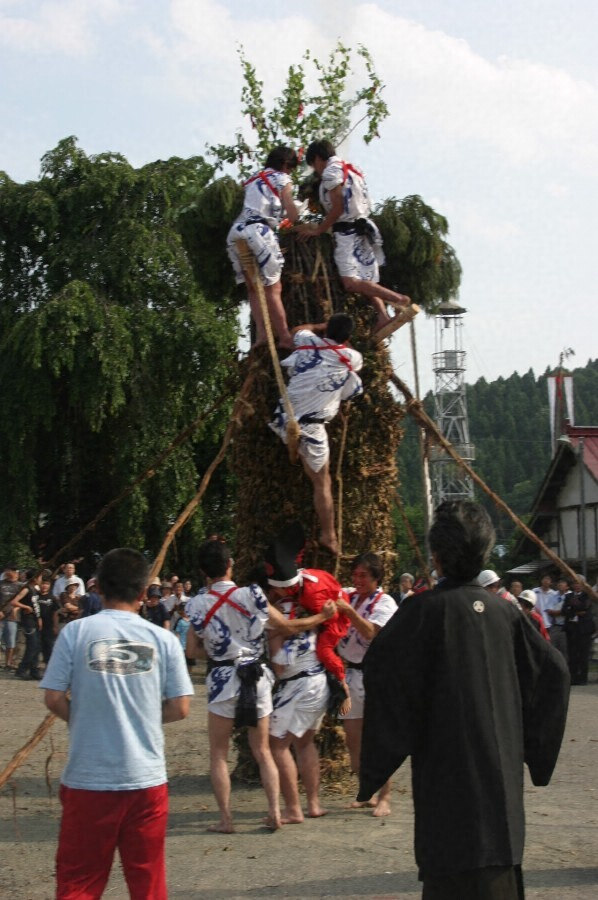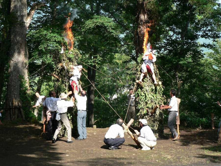 この行事は、大きな柱の先端に御幣や榊を付け、それへの点火を競う行事で、現在、飯山市小菅や木島平村内山・南鴨などで行われている。