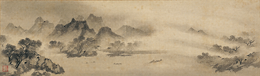 夕闇迫る漁村の風景が、多彩な水墨技法を駆使してみごとに描きだされた一幅である。湿潤な大気と明暗を宿す光の表出、ことに画面の右半分をつらぬく斜陽の表現は劇的とさえいえる。中国江南地方、瀟水(しょうすい)と湘江(しょうこう)周辺の8つの景勝を描いた「瀟湘八景(しょうしょうはっけい)図」のうちの1図。同様に足利義満の鑑蔵印「道有(どうゆう)」が捺され、法量も一致する作品が他に3幅現存し、もとは八景を備えた画巻を、義満が座敷飾りのために切断したものと考えられている。筆者の牧谿は南宋末の禅僧であるが、中国よりもむしろ日本で高く評価され、わが国の水墨画に多大な影響をおよぼした。