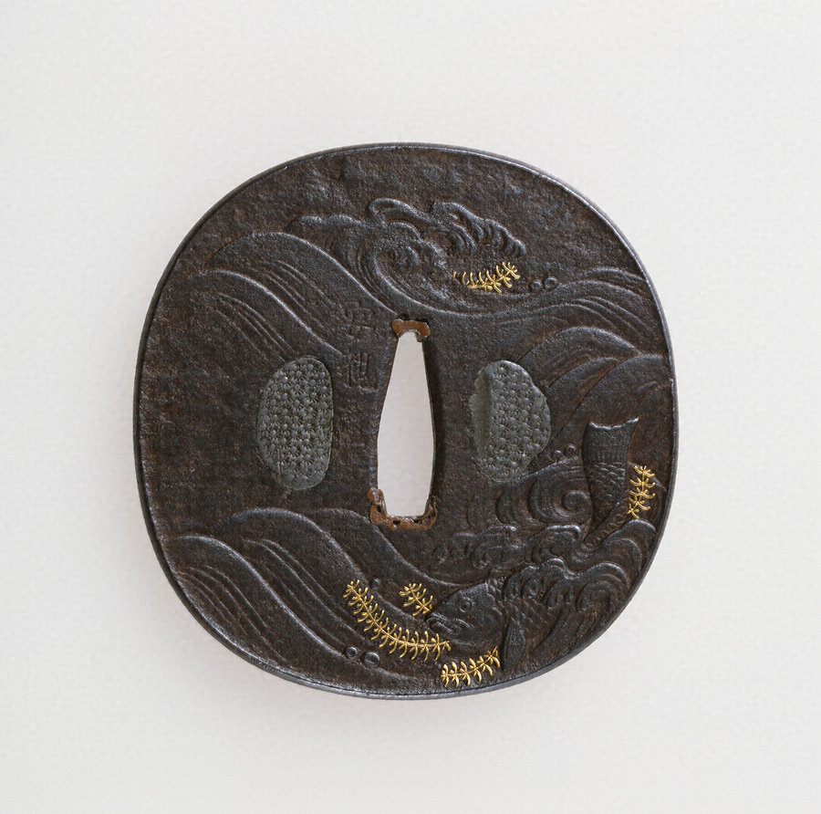 当館の刀剣・刀装具は明治の刀剣・刀装具の大収集家としてしられる光村龍獅堂(利藻)(1877〜1955)の旧蔵品が中心となっている。龍獅堂は明治維新とともに消えようとする刀剣・刀装具の技を絶やさぬため、伝世品収集の傍ら同時代の工人に拵の新調を依頼することもあった。ここでは代表的な作品を紹介する。波に鯉図鐔、江戸時代中期の名工土屋安親(1670〜1744)の作。牡丹に蝶図鍔は、帝室技芸員となった加納夏雄(1828〜1898)の作で、波芦蒔絵腰刀拵を合作した柴田是真(1807〜1891)とともに帝室技芸員(ていしつぎげいいん)となり、幕末明治に活躍した名工である。
