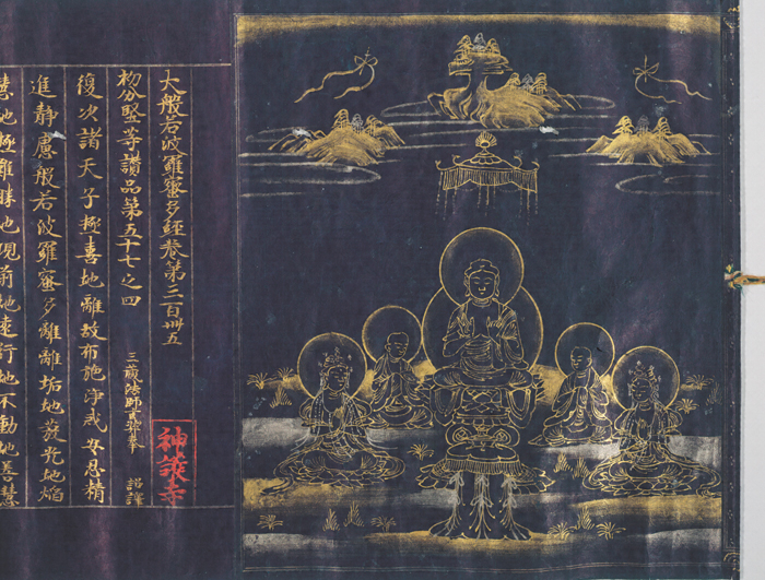 京都高雄の神護寺に伝来した紺紙金字の一切経、いわゆる神護寺経の内の1巻。神護寺経は平安時代を代表する金字一切経で、紺紙に銀泥で界線を施し、金泥で経文を書写している。表紙は紺紙に金銀泥で宝相華唐草文を表わし、見返しは紺紙に金銀泥で霊鷲山を背景とした釈迦説法図を描いている。また鍍金された撥型の軸端には、毛彫りで宝相華唐草を表わしている。