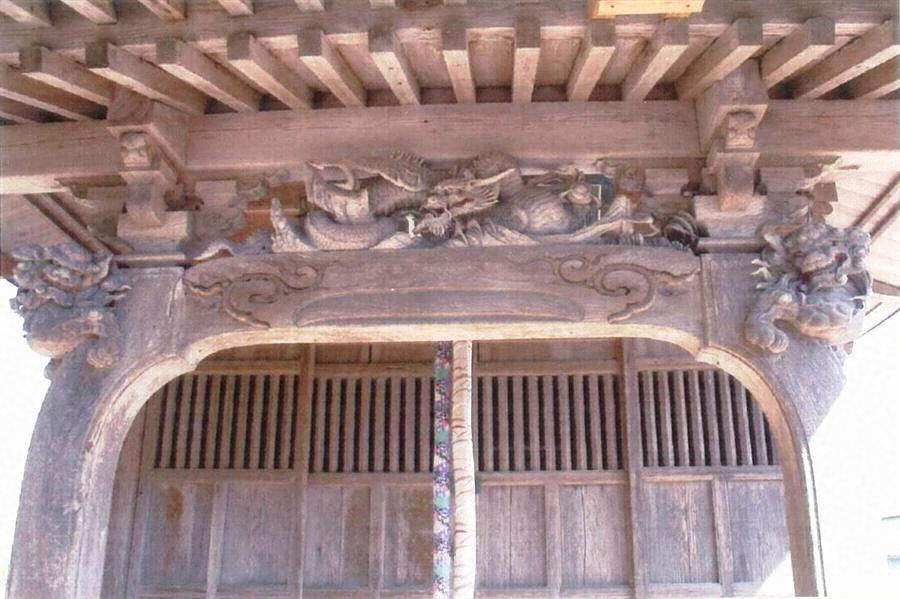 本殿の前方,石基壇上に建つ。正面の柱間2.8m,梁間2.8m規模の入母屋造,銅板葺,平入拝殿。向拝柱に根曲材を用い,正面上部を櫛形に見せているのが特徴で,水引虹梁上部の龍や木鼻の唐獅子の彫物も躍動的で見応えがある。技巧的な技術に優れ,貴重。