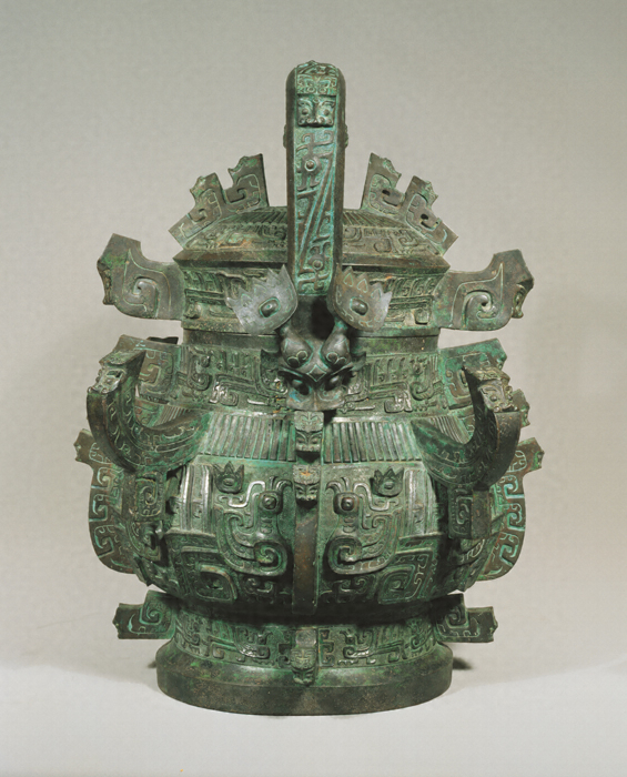 器身に大きく直条文(縦じまの文様)と浮き彫りの鳥文(鳳凰文)を飾り、凹凸の激しい稜脊(りょうせき)(鰭飾り)を持つ。さらに、稜脊の間には木の枝のように水平に伸びる装飾が加えられて、全体がすきまなく立体装飾でうめつくされている。蓋にも同じ趣向の装飾がついている。器底と蓋の裏に「婦〓作文〓日癸尊彝析子孫」という銘文がある。このような卣(ゆう)は1930年代に陜西省宝鶏市(せんせいしょうほうけいし)で見つかった柉禁(へんきん)という青銅器セット(現メトロポリタン美術館蔵)にも含まれていて、本例も商末周初期の重要な器として作られたと考えられる。近年、河南省安陽市殷墟(かなんしょうあんようしいんきょ)でこれらの卣の鋳型が発見されていて、商末周初期の青銅器を研究する上で非常に重要な器といえよう。