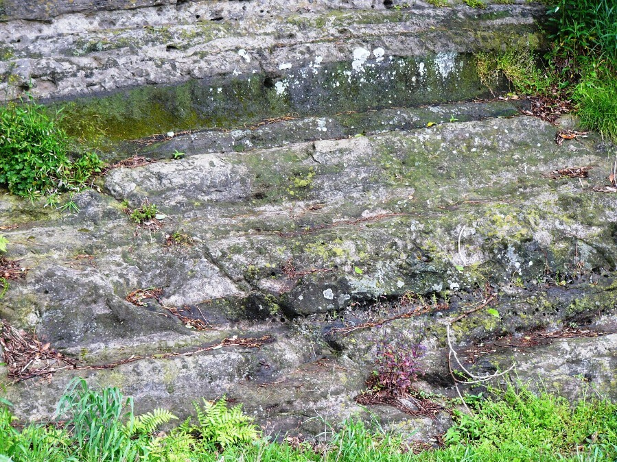 溪谷ニ臨メル第三紀凝灰質砂岩ノ絶壁ニ往古ノ汀線ヲ示セル穿孔貝ノ穿テル穴ノ遺蹟アリテ四段ヲ成ス第一段ハ大正ノ大地震以前ノ汀線第二段ハ元禄十六年ノ大地震第三段ハ弘仁九年ノ大地震直前ニ於ケル汀線ナルコトハ口碑及岩壁ニ働ク風化作用ノ速度ヲ計算シテ知ルヲ得ベシ隆起海岸ハ必ズシモ稀ナラザルモ明カニ古代地震ノ際ニ隆起セルコトヲ推定シ得ルモノハ其ノ類例甚ダ稀ナリトス