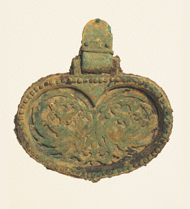 珠城山(たまきやま)古墳群は大和盆地の東南部周縁に位置する三輪山の、すぐ北に続く巻向山の別峯、穴師山から、西北に向かって張り出す丘陵の上に立地する。3号墳は3基の古墳群の中の1基で、全長47.5メートルの前方後円墳である。遺物は後円部の横穴式石室から発見されている。杏葉は馬具の一種で、胸繋(むながい)、尻繋(しりがい)の垂飾として用いられる。この遺物も心葉形の鉄地板に、地枕を重ね、透彫りの薄板を重ね、厚い縁板を多数の笠鋲で留めた金銅製品である。薄板は中央の下端部に三葉形を置き、左右に対称的に向き合う鳳凰文を配した図柄を透彫りし、さらに精緻な線刻で文様を描き起こした優品である。また立聞(たちぎき)の方孔には、鏡板(番号728-6)と同様の仕様を施す。本遺品は鏡板とともに古墳時代後期の6世紀後半に属する。そこに採用された文様の意匠は、斬新で精巧かつ華麗であり、古墳時代工芸技術の粋を表すもので、中国の六朝文化の影響を濃厚に受けたものとみられる。