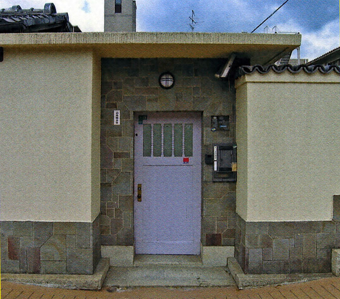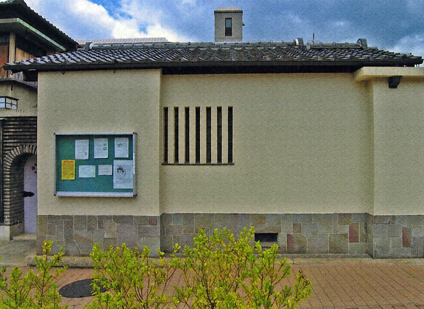 通りに面して南北棟で建つ。桁行3.9m梁間4.0mで、切妻造桟瓦葺とし、外壁は足下を鉄平石貼とするモルタル掻き落とし仕上げである。北に薄い水平のコンクリート版を出し、その下少し奥に鉄平石貼の壁を設け、扉を建てて脇門とする。