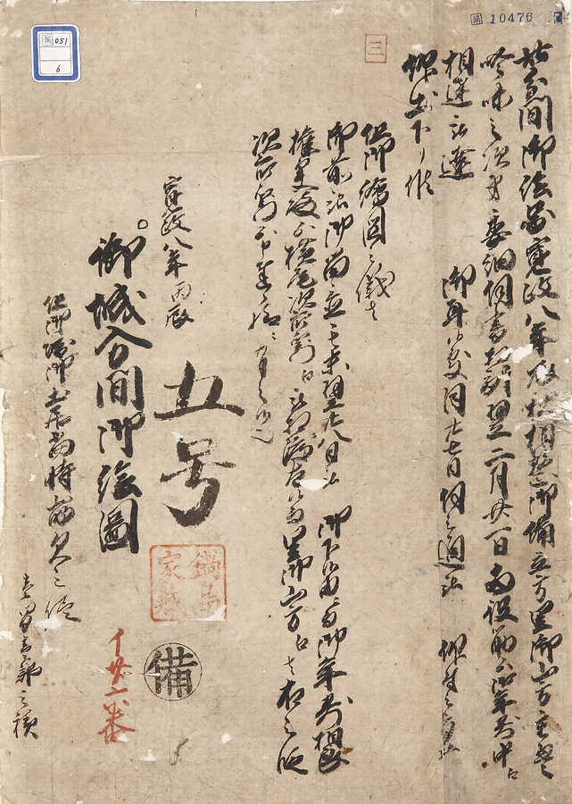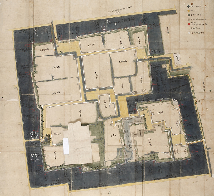 佐賀城は四周を堀に囲われた平城である。その堀幅は江戸初期の寛永年間に最も広い地点で50間(≒100m)であった。ところが経年により次第に土手を抑える板が朽ち始め、堀端の土が崩落し堀幅が広がっていった。そこで享保20年(1735)、5代鍋島宗茂は幕府へ補修許可願いを出しており、6代鍋島宗教が一部を修復したが財源を確保できず完遂しなかった。それから数十年を経た、寛政8年(1796)本格的補修のために作成されたのが本図である。堀幅補修にあたっては正保2年(1645)に幕府へ提出した城絵図が基準とされており、現状の絵図上に朱線で「正保二年 公儀上リ御絵図御堀幅」が示されている。また局地的に現状と正保期における堀幅が注記されているが、なかには5間近く広がっている箇所もある。このほか護岸の石組や樹木の表現も詳細で、城下絵図や文字資料では分からない佐賀城の詳細を知ることができる点で貴重である。