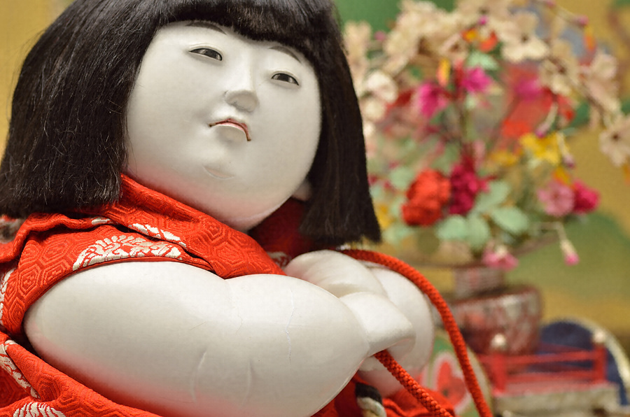 牡丹や枝垂れ桜を飾った花車を曳く御所人形。御所人形とは頭が大きく体の丸々とした幼児の人形で、木彫や練物などで素地をつくり、膠をまぜた胡粉を何度も塗り重ね磨いて仕上げる。これは11代鍋島直大・栄子夫妻が明治40年(1907)に新調した8体の人形のうちの一つで、ふくよかな体躯と白く輝く地肌、利かん気な表情が魅力的な御所人形である。