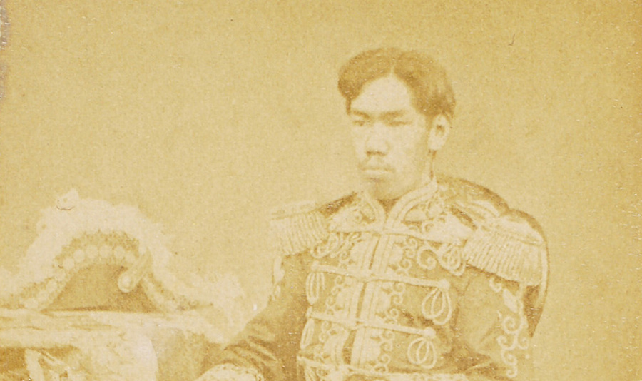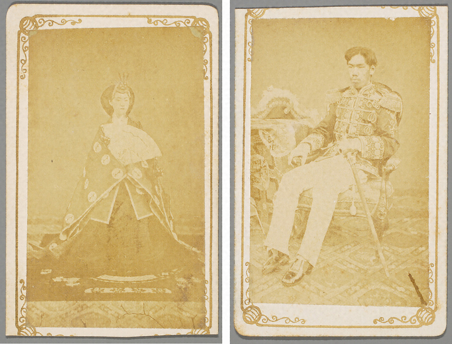 最初に明治天皇・皇后両陛下を謹写したのは内田九一である。弘化3年長崎に生まれた九一は上野彦馬のもとで修行、慶応2年(1866)に横浜馬車道で開業したのち、明治2年浅草瓦町で写場を開業し、ここを本拠地として活動したという。明治6年に撮影された肖像は名刺判写真で四隅に唐草を描いた台紙及び鶏卵紙の裁ち方は非常に雑である。台紙裏面は無地で写真館は分らないが、内田九一撮影と同じ肖像。ただ、東京都写真美術館蔵の明治天皇像とは手足の位置が異なる。