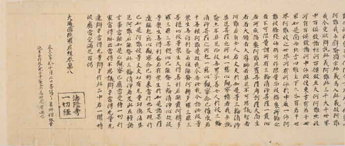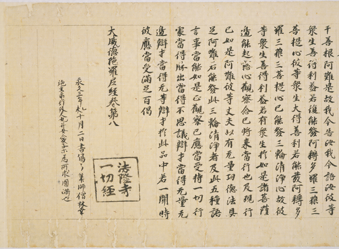 永久3年(1115)に僧林幸によって書写された、いわゆる法隆寺一切経の内の1巻。法隆寺一切経は、承徳3年(1099)前後、永久2年(1114)から元永元年(1118)、保安3年(1122)以降の三期にわたって勧進書写されたもので、僧林幸の保安3年の「一切経勧進状」によって、写経の目的・経緯・内容を知ることができる。これによれば、第二期は僧勝賢の勧進によるもので、5年間に2700余巻が書写された。本巻はその内の1巻に当たり、第三期の中心人物である林幸が、すでに第二期に筆師として活躍していたことを示す貴重な遺品である。巻首・巻尾・継目の紙背(四ヵ所)に「法隆寺/一切経」の黒方印が捺されている。