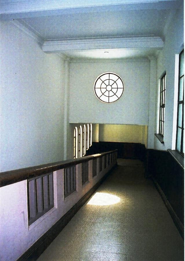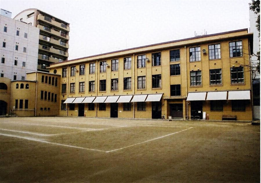 西館の北面東端と渡廊下で接続する鉄筋コンクリート造3階建。西端の南への突出部は2、3階へのスロープで、端部を四半円形につくる。南面東寄りに運動場への出入口を開く。内部は北側片廊下で教室が並び、東端は特別教室とした。3階窓上庇が水平線を強調。