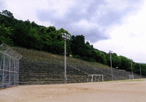 国領川に面する敷地に建設された競技場の観覧席。西端において緩やかに湾曲する延長170m、最大27段の玉石空積による階段状の構造物で、背面の山の斜面の擁壁を兼ねる。鉱山職員の労働奉仕により築かれた福利厚生施設で、鉱山における生活の一面を物語る。