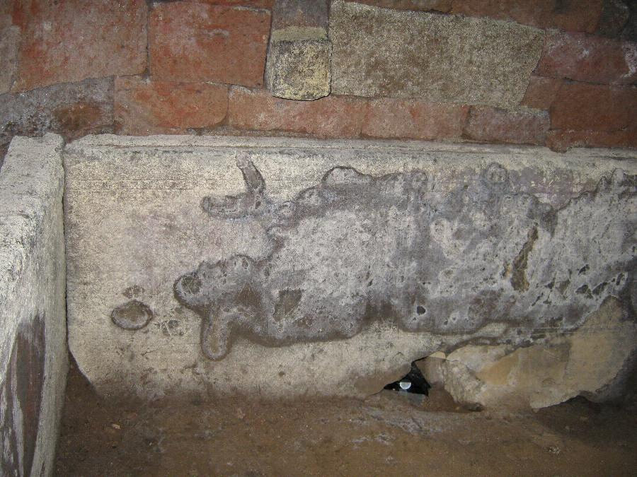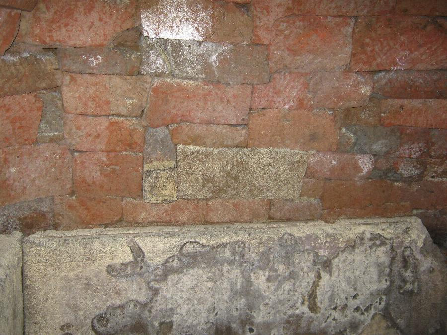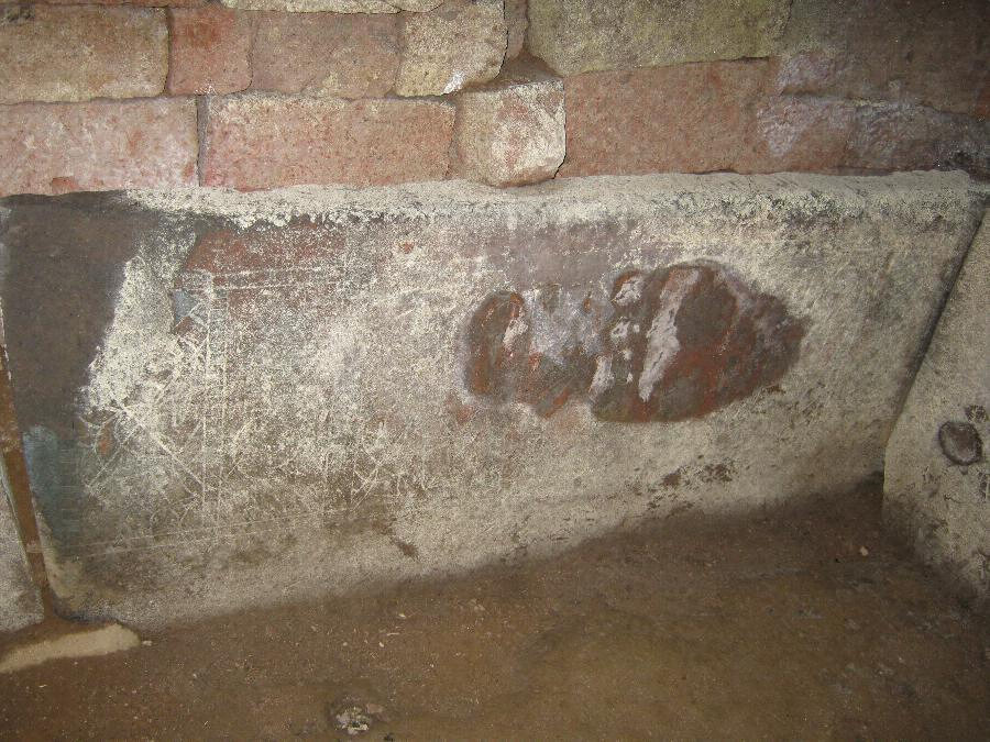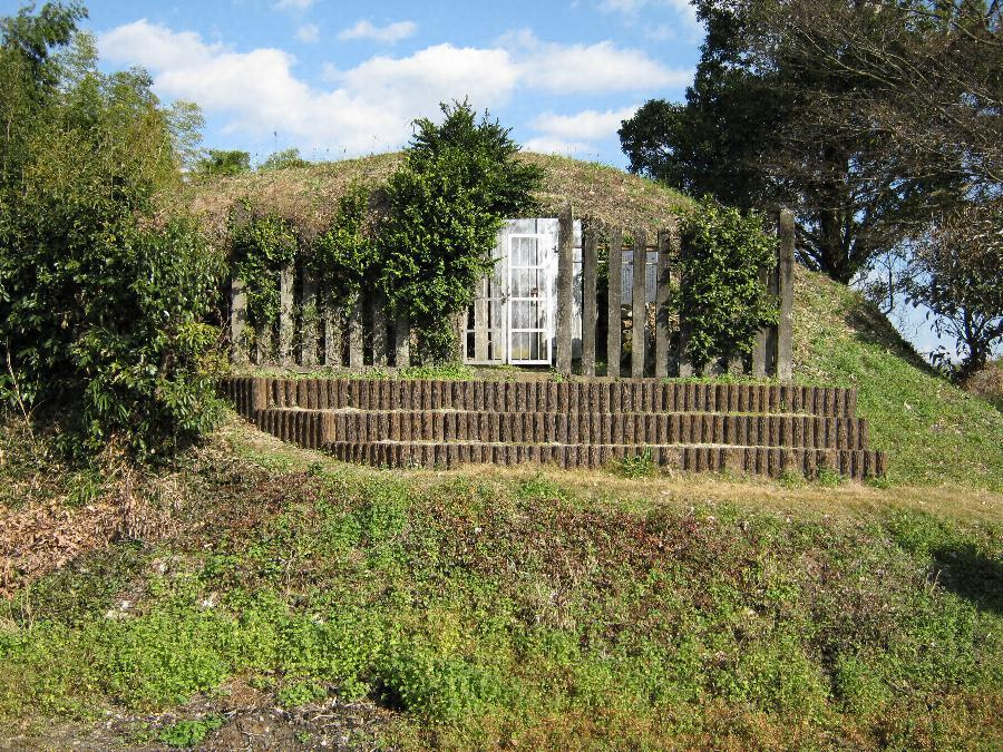 低キ丘陵ノ一端ニアリ封土ノ原形ハ明カナラサルモ石室ハ略西面シ阿蘇熔岩ノ切石ヲ以テ作リ石室ノ主軸七尺三寸五分幅六尺八寸五分入口ノ幅二尺高サ約四尺石室ノ四周ニハ底ニ近ク切石ヲ以テ槨壁ヲ作リ其ノ内面ニ色彩ヲ施セル装飾模様ヲ刻セリ