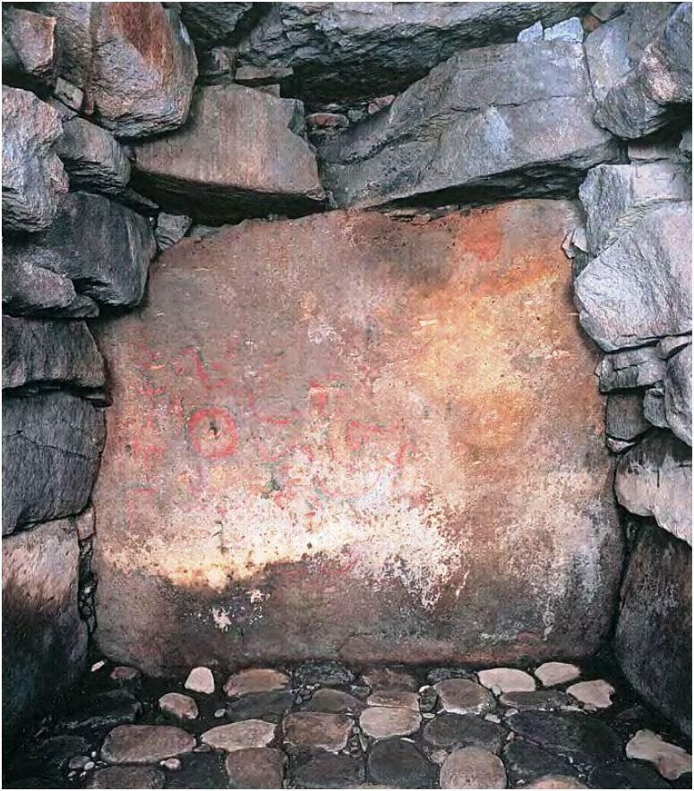 一号墳の彩画は、障石前面と奥壁に認められる。顔料は赤と緑を併用しており、赤で文様の形を描いた後、緑で縁取りしたものが多い。障石には縦縞文様が描かれ、奥壁には、人物・動物・鳥・飛鳥(?)・舟(?)・円形・楕円形・x字状などの文様が描かれる。二号墳では、石室(玄室)内面がほぼ全面に赤彩されるが、壁画は奥壁にのみ認められる。赤彩の上に緑で文様が描かれており、馬上で弓を引く人物・同心円文・複線の連続山形文がある。