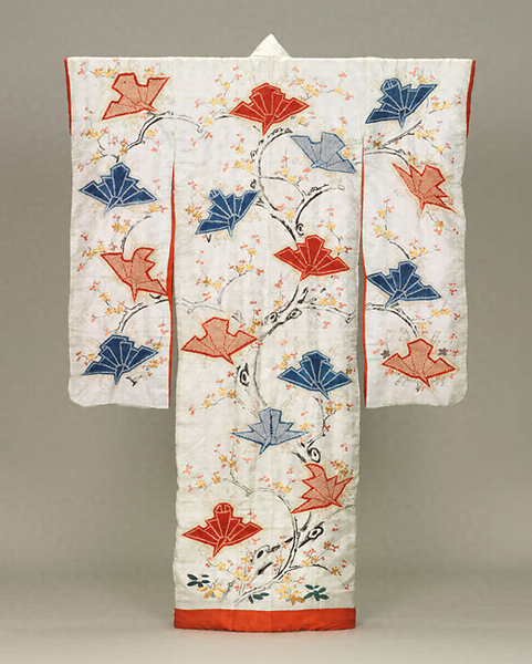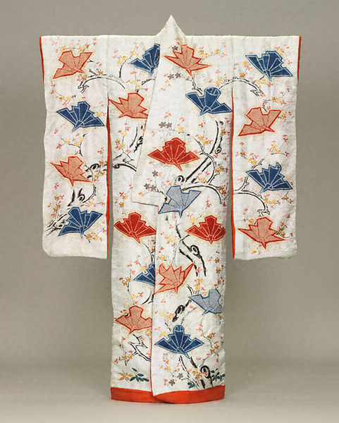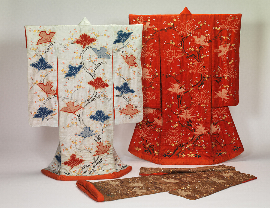 吉祥模様である梅と熨斗を表した婚礼用打掛。同じデザインで紅・白・茶の三領が一組となる。両袖に勇ましく枝を伸ばす梅樹の写生画的な描写と、熨斗蝶の抽象的な描写が明快で、散りばめられた梅花が可憐な華やかさを添える。