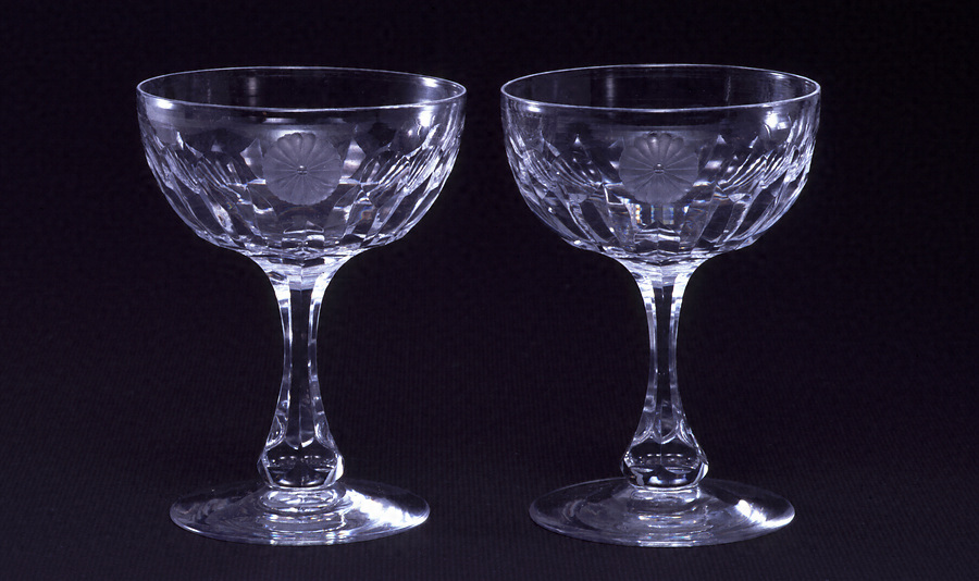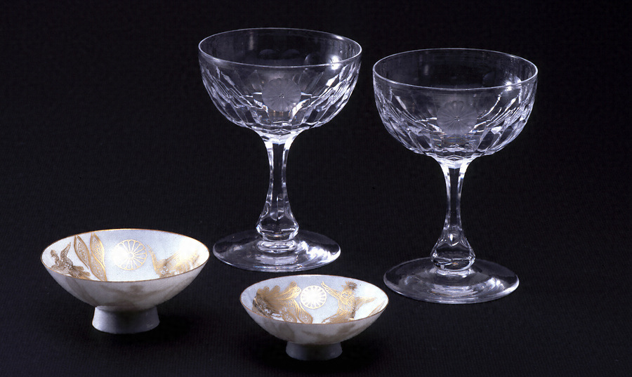明治25年(1892)7月9・10日、永田町鍋島邸(現在の首相官邸一帯)新築落成祝いのための明治天皇、皇后の行幸啓の際に下賜された品。盃は薄手の白磁に金彩で菊御紋、鳳凰をあらわす。玻璃コップはカット技法で切子の面をつくり、胴部中央に菊御紋をクラヴィール技法であらわす。三枚一組の銀製盃は見込みに毛彫で唐草文様をめぐらし、三方に菊御紋を配す。この日鍋島家では新築の西洋館・日本館において御能、相撲、柔、剣術、琴演奏、手品等の余興を披露している。