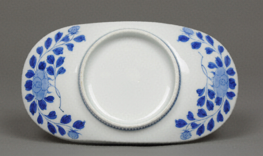 横にゆったりと広がる舟形の器形で、見込みには楽しそうに泳ぐ2匹の金魚と水草を染付であらわす。外側面の左右には将軍家献上用の裏文様である牡丹唐草文をあらわす。8代鍋島治茂時代の記録『泰国院様御年譜地取 七』によると、安永3年(1774)将軍家より注文のお好みの陶器12通りのひとつ「金魚絵舟形皿」に相当する意匠であることが分かる。
