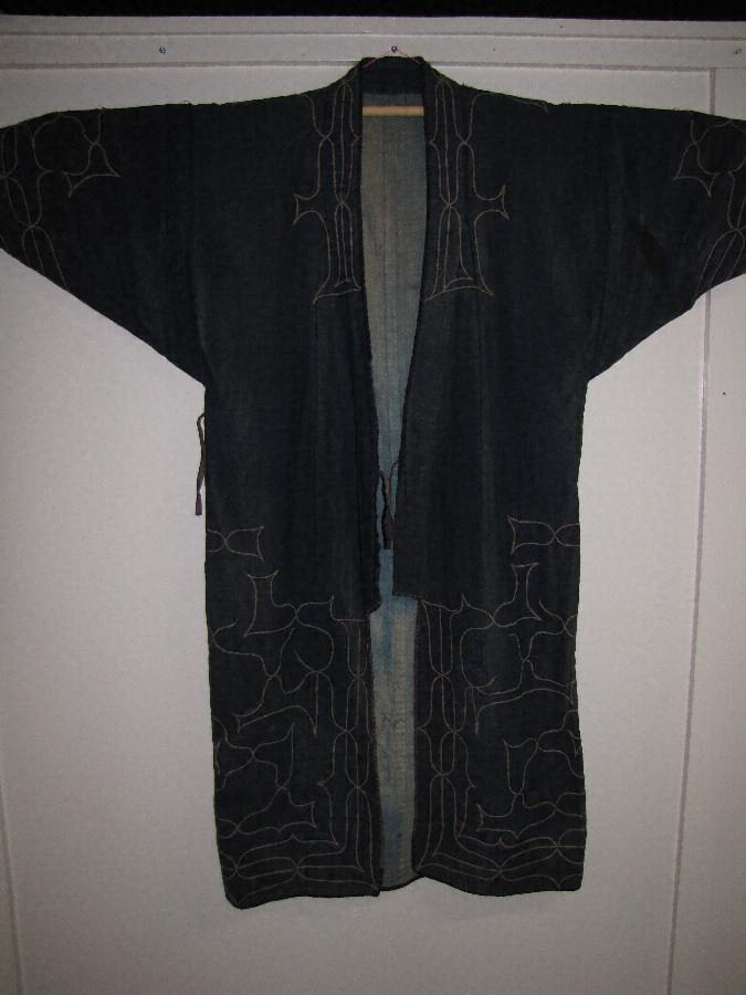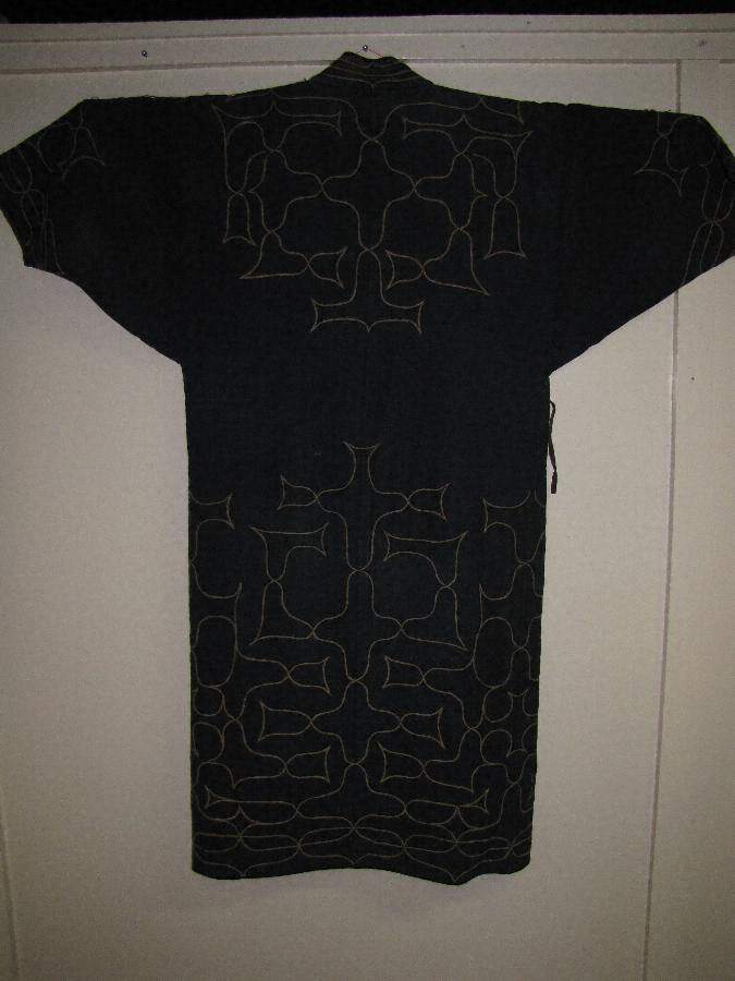 紺木綿製。衽のある着物の背、裾、袖口に白木綿糸で刺繍を施す。袖口と裾は覆輪を施す。