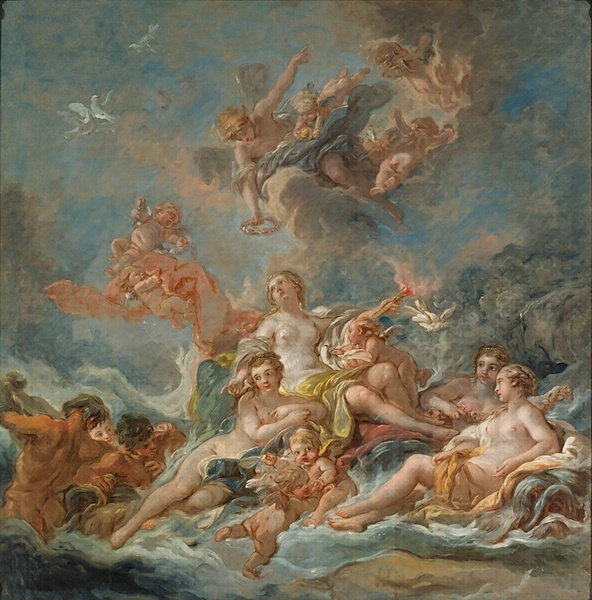このロココらしさにあふれた華麗な大作は、ブーシェの重要な作品のひとつに数えられる。本作において彼は、神話画に属する主題のなかで自らの最も得意とするヴィーナスの図像を扱い、美の女神が水中で誕生して陸に到着する姿を伸びやかに、屈託なく描いている。ほぼ2メートル四方の大画面なので、元来しかるべき重要な注文に由来する作品であることは間違いなく、これと対をなす図柄の作品も存在したかもしれないが、注文主や対作品については詳らかではない。この作品は、もと英国の大収集家であるリチャード・ウォーレス卿の所有で、パリ郊外ブーローニュに彼が持っていたバガテル宮を飾っていたことがあった。のち今世紀初頭には、その洗練された高雅な趣味で知られるウィーンの収集家ロスチャイルド男爵のもとにあり、さらにニューヨークのメトロポリタン美術館の収蔵となったが、その後、同美術館が本作を手離すこととなり、現在東京富士美術館の作品となっている。さてこの絵の画面中央では、水から上がったヴィーナスが青や黄の布を敷いた岩の上に腰をおろし、その周りをキューピッドたちが飛び交い、三美神が傍らに侍する。上空から風の神ゼフュロスが女神の頭上に勝利の冠を乗せようとしている。その横で降下しつつあるキューピッドの一人が手にしているのは、永遠の美を象徴するリンゴである。左方では、海神ネプチューンの息子であるトリトンやニンフが水中で歓び戯れている。女神のすぐ前で横たわりながらこちらを向いているニンフは、美しく官能的な裸身によって、いかにもブーシェらしい特徴を示し、この画面の中で最も強く鑑賞者の眼をひく部分となっている。主題の上では、1740年のサロンに出品した《ヴィーナスの誕生》(ストックホルム国立美術館蔵)に近く、構図の上では、最晩年の4点のシリーズ(アメリカ、キンベル美術館蔵)に類似している。数多いサロン出品作ほどの完成度がここに見られないのは、おそらく大きな室内の壁の上方や天井など、ある程度の距離をおいて見られる場所に置かれるべきものであったのかも知れない。遠い眼で見た時にほど良い印象にするために、画家が巧みに仕上げを計算したのであろう。いずれにせよ本作に見るような裸婦群像は、この画家の最も得意とするテーマで、ロココ趣味あふれるブーシェ様式の典型を示すもので、彼の天賦の装飾的手腕を証明する神話画の佳作であることは間違いない。