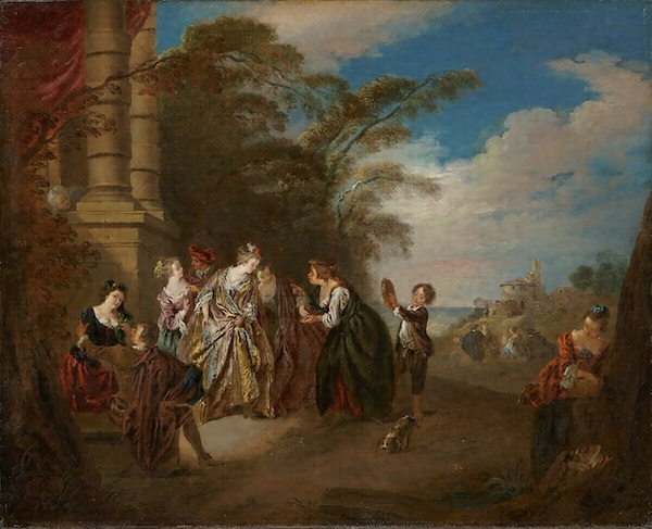 パテルは同郷のヴァトーの弟子で、その様式の模倣者であった。師ヴァトーは、フェート・ギャラント(雅宴画、田園の宴ともいう)の分野の最も著名な画家であった。ここでは、森を拓いた庭の一角で柱の前に集い、恋の語らいに興じる男女が描かれ、ピンクと黄色のサテンのドレスを着た娘が占い師に手相を見てもらっている。右手遠景には一群の男女が憩い、塔のある家も見える。この構図は師ヴァトーの《生の魅惑》を想起させるが、人物の配置や背景の描写には舞台とその書き割りのような平板な印象も否めない。