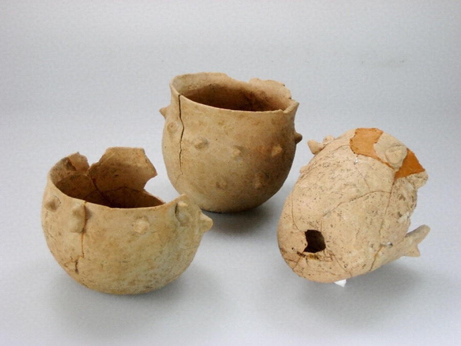 勾玉など、玉類を模したと思われる装飾を付した器です。西畑屋遺跡からは多量の土器や祭祀用品が出土しています。当地の川の近くで焚火の跡が数箇所見つかっていることから飲食を伴うまつりが行われた場所であったようです。この土製品はまつりの際に使用されたものだと考えられます。口径、高さ、(大)115×100mm、(中)100×80mm、(小)95×95mm