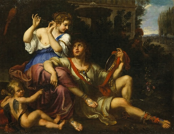 リナルドとアルミーダは、16世紀末頃にイタリアの詩人タッソーによって書かれた叙事詩『解放されたエルサレム』に登場する恋人たちである。物語の舞台は、第1回十字軍がエルサレム奪回をめざして進む11世紀末。十字軍の勇士リナルドの活躍に、十字軍を壊滅するよう命を受けた美しい魔女アルミーダが挑戦する。ところが彼女の憎しみは間もなく愛に変わり、二人は運命的な恋に落ちてしまう。この物語は17世紀から18世紀にかけてイタリアやフランスの画家に好まれた主題で、ミニャールと同時代のヴァン・ダイクやプッサン等も描いている。この絵では幸福の島に憩う恋人たちがクピドとともに大きく描かれており、リナルドはアルミーダの瞳の中に、アルミーダはリナルドが差し出した鏡の中に、それぞれ愛に燃える自分自身を見い出す場面である。背後ではアルミーダの愛の魔法にかかった戦友を救出しようとやってきた騎士二人が草むらから顔を覗かせている。このあと物語は、自らの使命を果たすべく愛を捨て、恋人のもとを去ろうとするリナルドに、アルミーダが呪いをかける場面へと展開する。作者のニコラ・ミニャールは、画家ピエール・ミニャールの兄で、「アヴィニヨンのミニャール」とも呼ばれた。国王ルイ14世の宮廷画家となり、貴族社会の中で高い評価を受けて、貴族たちを最良の顧客とした。
