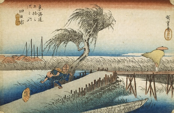 画中右では三重川に架かった何とも粗末な橋を、風に吹き飛ばされないように渡っている姿が何とも危うい。画中左では旅人が飛ばされた笠をあわてて追いかけているのも、その危うさを強める。広重の絵では珍しく風の動きを見せた図でもある。北斎『冨嶽三十六景』の「駿州江尻」との比較も一興。