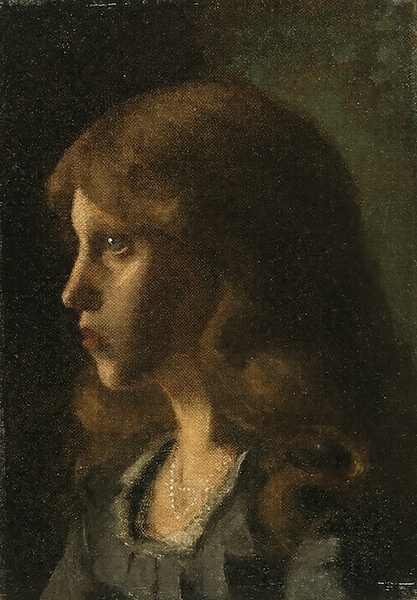 クリムトが18歳の頃の作品。この頃のクリムトは、弟のエルンスト・クリムト、画家のフランツ・マッチュと共同で「芸術家商会」を営み、ウィーンのブルク劇場やヘルメスヴィラ、美術史美術館などの壁面や天井の絵画装飾を手がけていた。 グリーン系の落ち着いた色調でまとめられた画面の中で、ひときわ目を引く少女の瞳の青と唇の赤、そして胸元を飾るネックレスの輝く白が印象に残る。 若き日の小品ではあるが、後のクリムトの絵画を特色づける装飾性の萌芽を感じることができる貴重な作品。