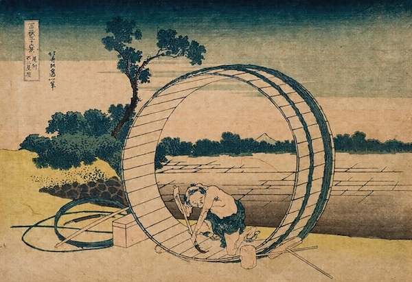 職人が大きな桶の製作に一心に取り組んでいる。その桶を通して、遠方に小さく富士が見える。大きな円と小さな三角形とが組み合わされた、大胆、奇抜な構図で、見る者をその円の中に引きずり込む。その北斎の力量に驚く。画中に描かれた職人は、約15年前に刊行されている『北斎漫画』にも登場している。この版では職人が作業している地面に薄緑の配色が施されているが、青色の配色が施されているバージョンのものもある。また、桶の右手の田畑に板木の瑕を繕った後が見られる版が多いが、この版ではその瑕が見られない。