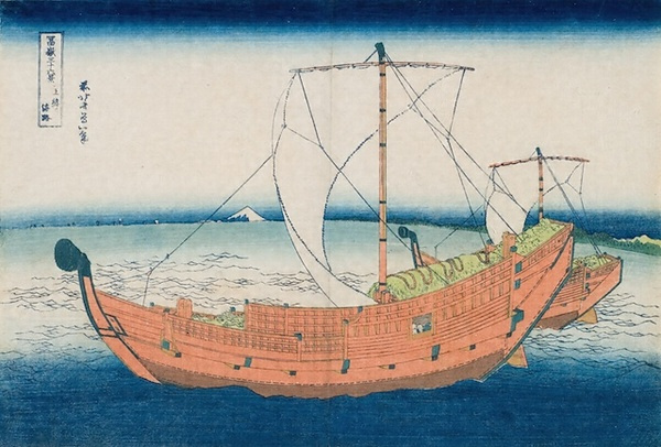 五大力船と呼ばれる、江戸を中心に、関東周辺の海運に活躍した50~500石積級の小廻(こまわ)しの廻船があった。なかでも江戸−木更津間を往復した貨客輸送の木更津船(きさらづぶね)を描いたのが本図であろう。画面には2隻の船が、精巧な描写で描かれている。側面に開いた窓からは乗客の頭が覗いている。大きく弧を描いた帆とその彼方に小さく見える富士。円く描かれた水平線は北斎が西洋から学んだものであろうか。