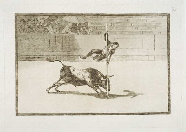 アビニャーニは1750~70年にかけて活躍し、敏捷な技で名をなした闘牛士。くっきりとした線で明快な効果を持つ闘牛士と牛に対し、後方の観客席はやや弱い線で描かれ、空気遠近法的な手法が駆使されている。軽業のような跳躍に対し、牡牛は攻撃目標を闘牛士を支える跳躍の棒に替えている。明るい地面を背景に筋肉質の牡牛の黒い姿態が重厚な存在感をもって迫ってくるのに対し、闘牛士のはなれ技はいとも軽やかである。
