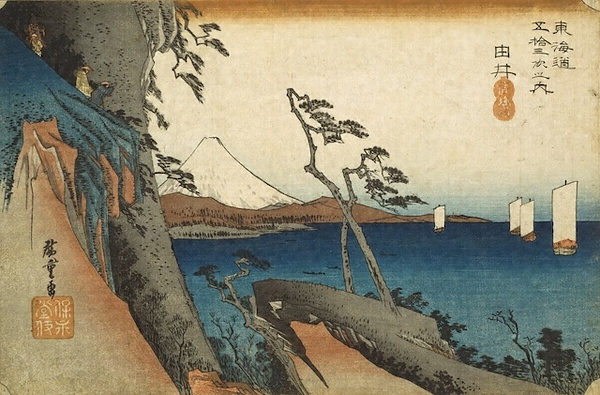 東海道の難所のひとつとして知られたのが現在の静岡県由比町である由井宿と興津宿との間にあった、薩■峠であった。海に面し切り立った峠を越えるとき、突然背後に見える富士の姿に、旅人は感動した。峠の道を通る以前は、崖の波打ち際の道を通っていた。押し寄せる荒波にさらわれる旅人も多く、「親知らず子知らず」と人々に呼ばれた危険な道だったという。駿河湾越しに見える富士の絶景と、峠の急な勾配の対比が美しい。一様に四角く描かれた船の帆も、様式化された美しさがある。