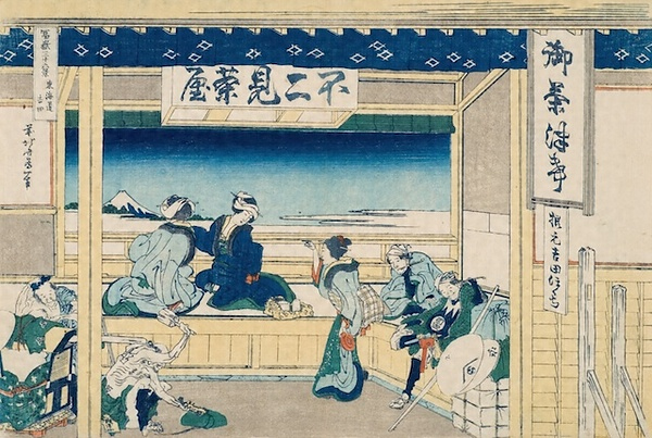 東海道の吉田は現在の愛知県豊橋市。その地にあった「不二見茶屋」の光景。茶屋奥の簾を上げると、そこには絵に描いたような富士の眺望があった。軒下の看板には「御茶津希(おちゃつけ)」の文字が、さらにその下には「根元吉田ほくち」とこの地の名産であった火口(火打ち石の火を受けるもの)の文字が見える。茶屋でくつろぐ右端の旅人の笠には「山型に巴紋」と「永」の字が、腹掛けには「寿」の字があり、版元である「永寿堂」の宣伝が、さりげなく施されている。画中左では篭屋の一人が草鞋を砧でたたいているのは、履きやすくするためであり、街道の茶屋ではよく見られた光景であったのだろう。