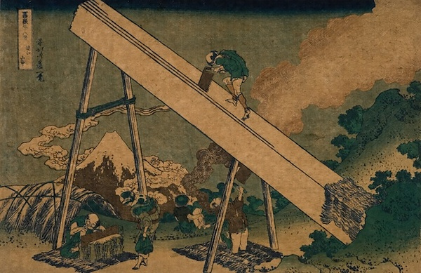 遠江は現在の静岡県。画面斜めに大きく描かれた巨大な材木と、その材木をささえる支柱。その形と相似した富士が、材木と支柱の間から見えるという、あまりにも大胆な構図に驚嘆する。画中に配された人物の描写も面白い。ありえないような技を見せ、鋸をひく職人たち。母親に背負われた赤子は、よく見ると真上の材木を一心に見つめている。さらに童子の横の焚き火の煙は洋画的な表現がほどこされ、たなびく煙の道筋は、巨大な材木と交差するように配されて画面の安定感を出すなど、北斎の力量が光る傑作である。この版は、保存状態が悪く、画面全体が茶色く変色している。改印、版元印はないが、初摺りのイメージと同じ配色の版と思われる。配色の違う版も残っている。