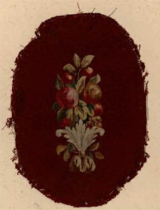 鮮やかな緋色地にギルランドを綴織で表す。椅子の背もたれ部分に張り込まれた裂と思われる。