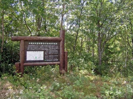 ・湧別川上流の左股沢沿い約100メートルにわたって露出している流紋岩球顆は、本来、流紋岩質黒曜岩中に晶出した球顆が、その岩体の下層に集積して、大型の球顆のみで厚層を形成したもので、その最上部の黒曜岩は標高1147メートルのほぼ平坦な尾根を形成しています。