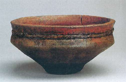 加曾利E式(縄文時代中期)。北江古田遺跡31号土抗で出土した土器。全体に赤漆が施され頭部に桜皮のタガがめぐらされている。
