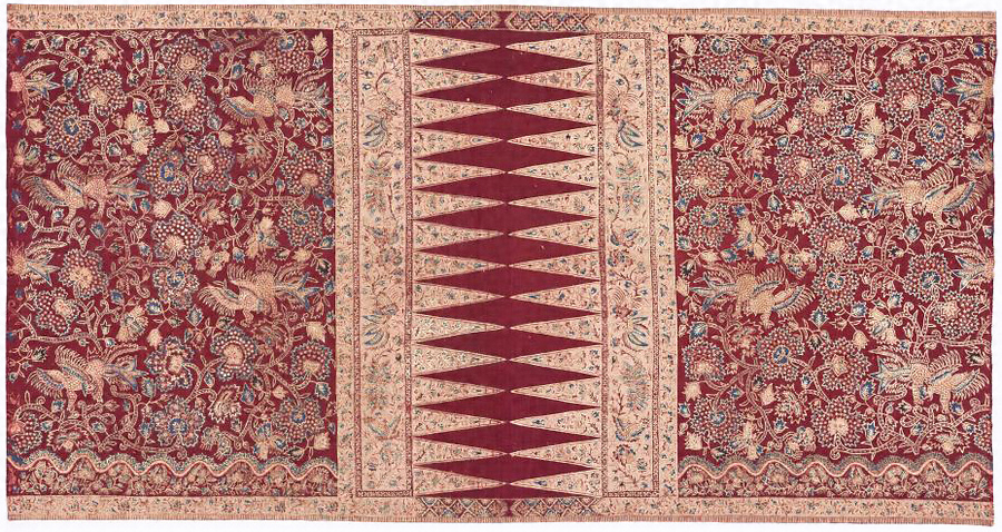 巻きつけて着用する腰衣(カイン・パンジャン)。クパラに鋸歯状のトゥンパル模様、バダンに花鳥模様、クモドとピンギルに小花鳥模様を蝋防染(バティック)で表し、模様のアウトラインに箔押しを施す。泥金を筆描きする方法もあるが、これは魚由来のゼラチン質による糊を布面に木版で置いた上に箔を押したものと思われる。旧カネボウコレクション 1211.90