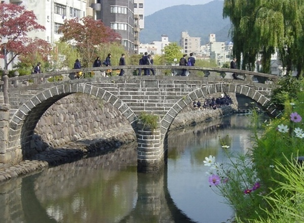 二連アーチ橋としては現存最古のものであり、また現在中島川にかゝっている長崎市内十二の橋のうち唯一の二連アーチ橋である。
