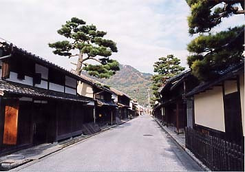 近江八幡市八幡は琵琶湖の東岸中央に位置し北国街道と中山道が交差する交通の要衝に発達した町で、近江商人の根拠地として反映した時代の瀟洒な主屋、土蔵群が多数現存しています。特に、大型町家と前庭の見越しの松が連続して並ぶ景観は圧巻です。