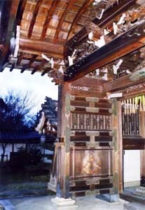 大師殿の正面,東面して建つ1間1戸の四脚門で,両側に折曲がりの築地塀が延びる。屋根は檜皮葺で,入母屋造・前後軒唐破風付。組物は三斗組と簡素だが,虹梁上に配された龍や獅子など多彩な彫刻,彫物欄間や板欄間,精緻な飾金具など,華やかな造形である。